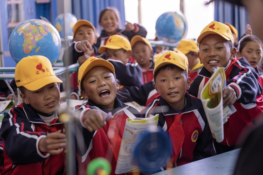 Pupils attend a science class at a primary school in Zhaxizom Township in Tingri County, Xigaze City, southwest China's Tibet Autonomous Region, June 5, 2023. The primary school of Zhaxizom Township is the closest school to Mount Qomolangma, with a distance of just over 40 kilometers. (Xinhua/Fei Maohua)