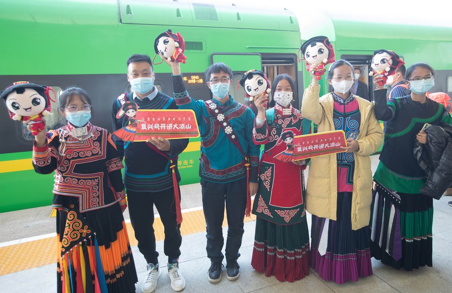 Students from Xide County who used to take the "slow train" for school pose for a group photo in front of D843 "Fuxing" bullet train at Xichang West Railway station in Xichang, Liangshan Yi Autonomous Prefecture, southwest China's Sichuan Province, Jan. 10, 2022.(Xinhua/Jiang Hongjing)