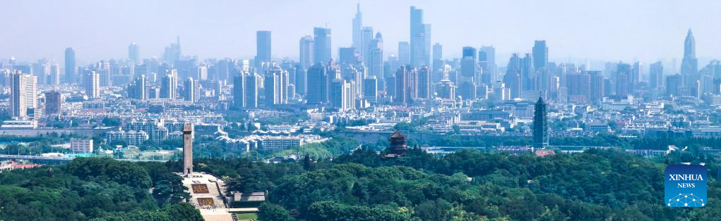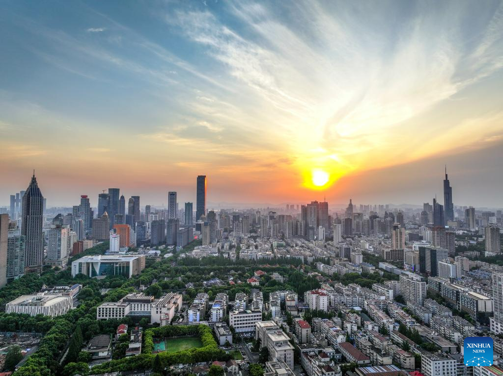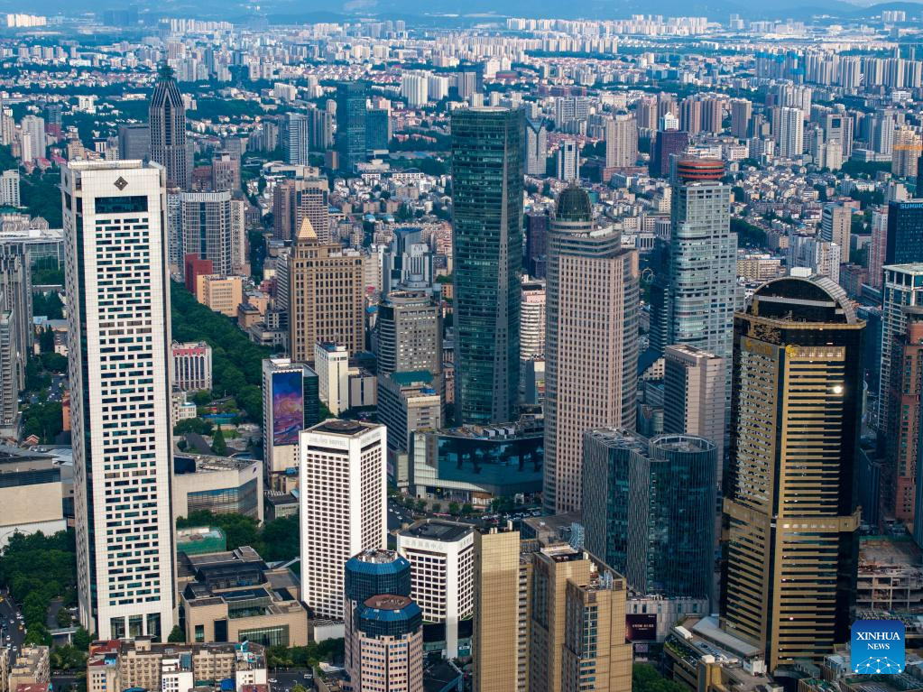This aerial photo taken on June 12, 2023 shows a view of Xinjiekou in Nanjing, east China's Jiangsu Province. Nanjing, the capital of six dynasties in ancient China, has rich cultural accumulation and unique cultural landscapes. (Xinhua/Li Bo)