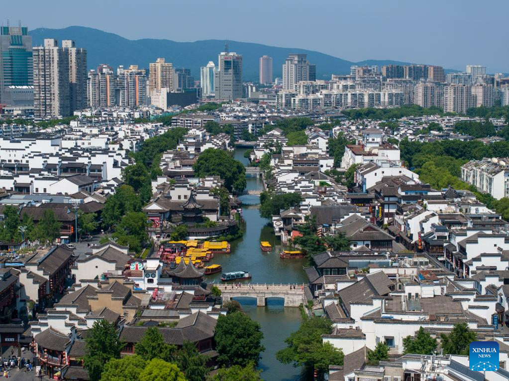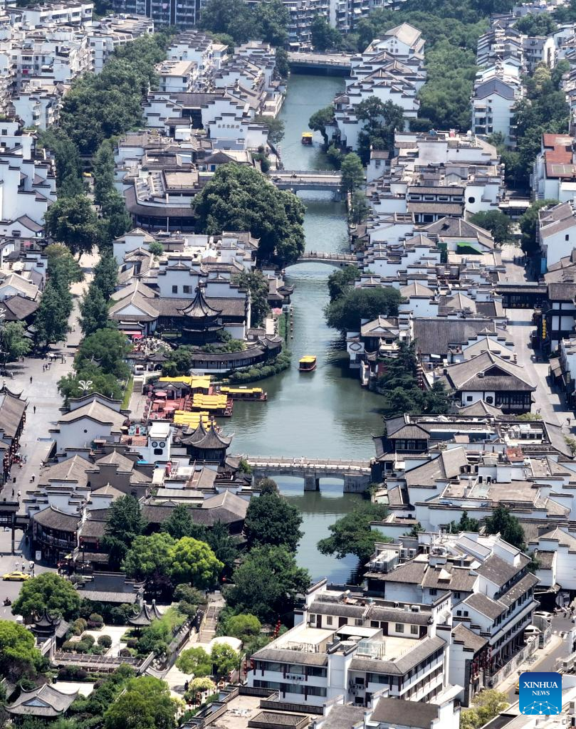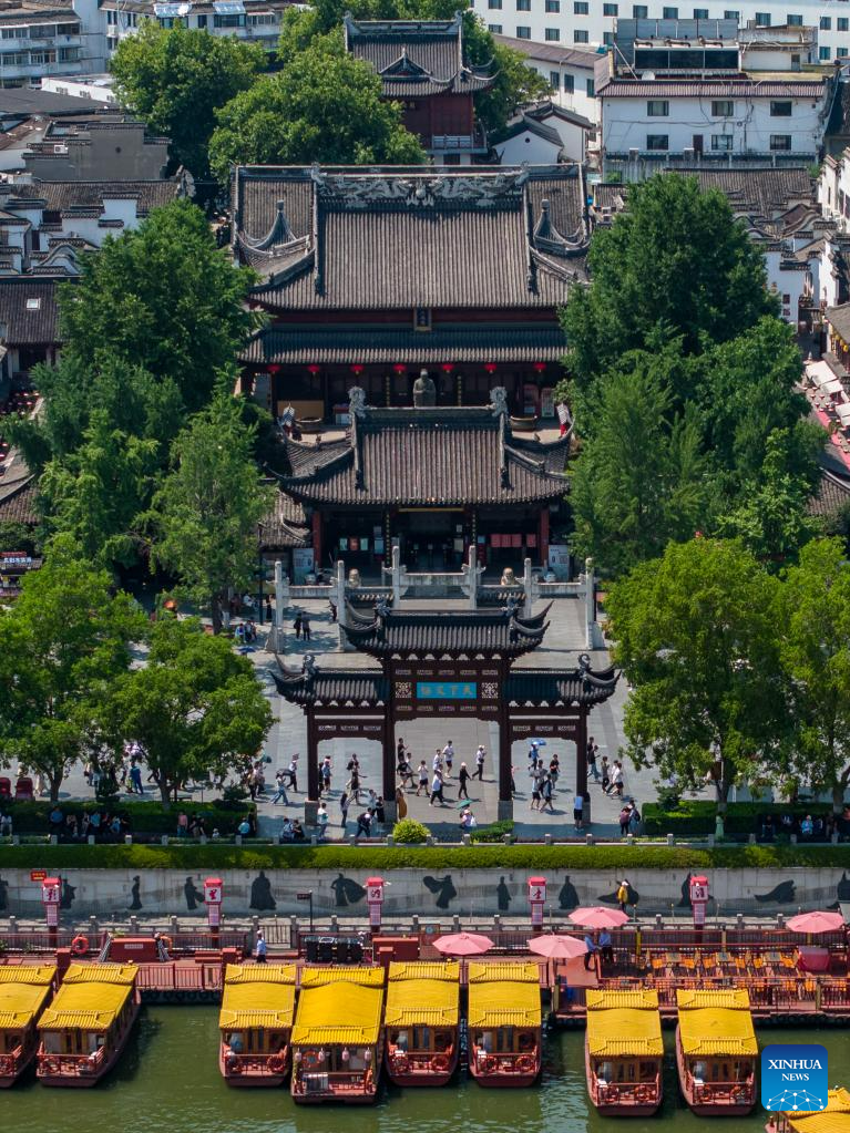 This aerial photo taken on June 12, 2023 shows tourists having fun at the Fuzi (Confucius) Temple scenic area in Nanjing, east China's Jiangsu Province. Nanjing, the capital of six dynasties in ancient China, has rich cultural accumulation and unique cultural landscapes. (Xinhua/Li Bo)