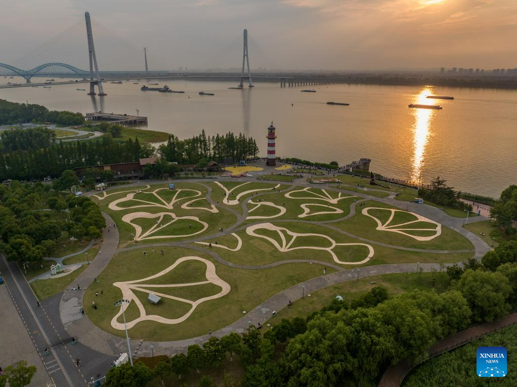 This aerial photo taken on June 13, 2023 shows the Yuzui wetland park in Nanjing, east China's Jiangsu Province. Nanjing, the capital of six dynasties in ancient China, has rich cultural accumulation and unique cultural landscapes. (Xinhua/Li Bo)