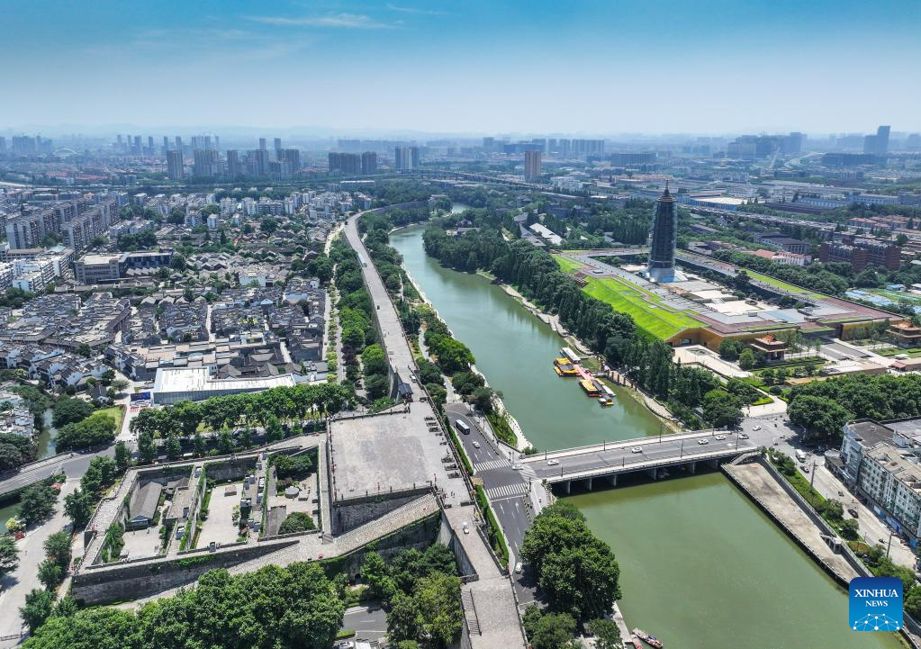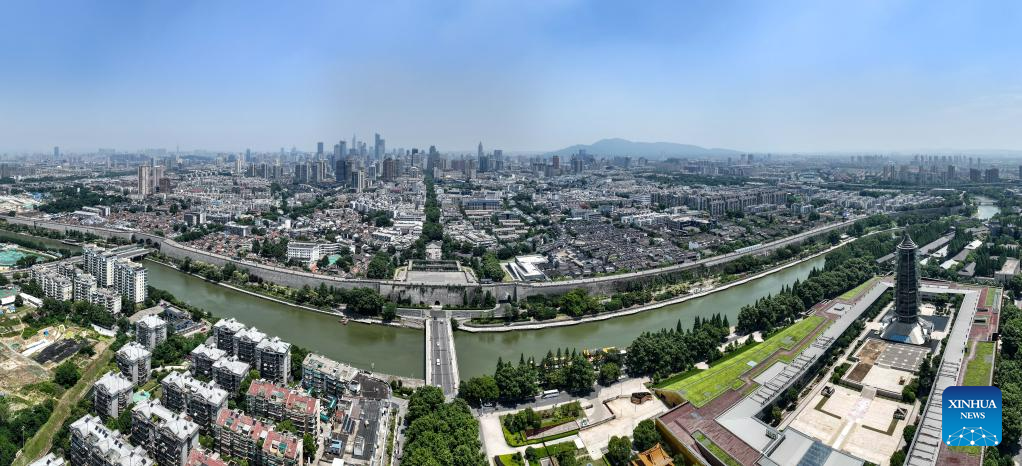 This aerial photo taken on June 9, 2023 shows a view of the Zhonghua Gate, the Grand Baoen Temple Heritage and Scenic Area and the Qinhuai River in Nanjing, east China's Jiangsu Province. Nanjing, the capital of six dynasties in ancient China, has rich cultural accumulation and unique cultural landscapes. (Xinhua/Yang Lei)