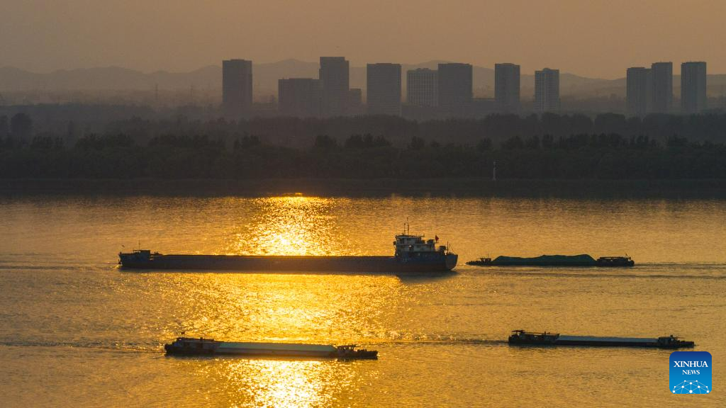 This aerial photo taken on June 13, 2023 shows cargo ships sailing on the Nanjing section of the Yangtze River in Nanjing, east China's Jiangsu Province. Nanjing, the capital of six dynasties in ancient China, has rich cultural accumulation and unique cultural landscapes. (Xinhua/Li Bo)