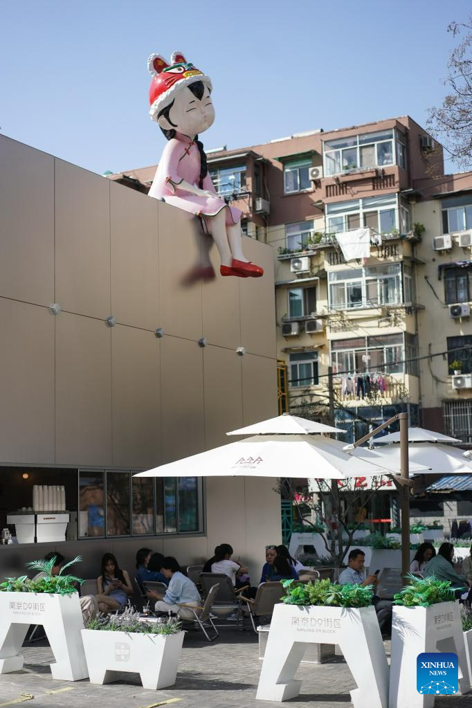 People enjoy themselves at a cafe of the D9 block, a cultural tourism consumption project built on urban industrial remains, in Xuanwu District of Nanjing, east China's Jiangsu Province, April 8, 2022. Nanjing, the capital of six dynasties in ancient China, has rich cultural accumulation and unique cultural landscapes. (Xinhua/Ji Chunpeng)