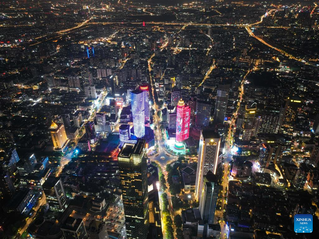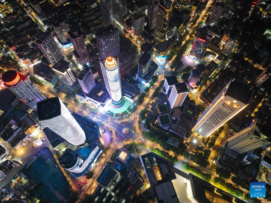 This aerial photo taken on June 12, 2023 shows a night view of Xinjiekou in Nanjing, east China's Jiangsu Province. Nanjing, the capital of six dynasties in ancient China, has rich cultural accumulation and unique cultural landscapes. (Xinhua/Ji Chunpeng)