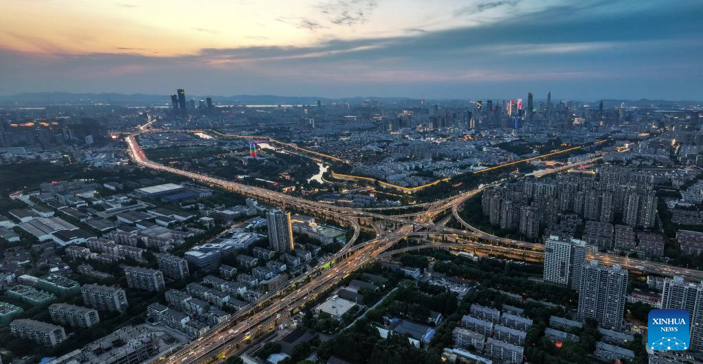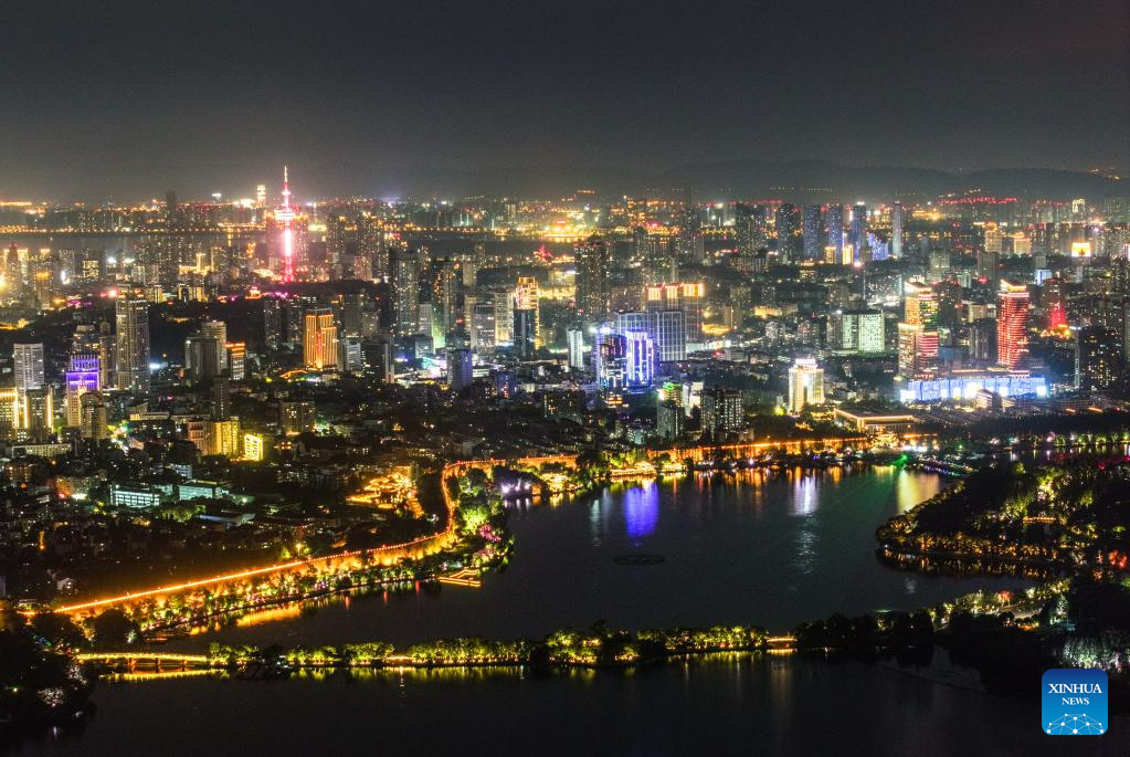 This aerial photo taken on June 12, 2023 shows a night view of Nanjing, east China's Jiangsu Province. Nanjing, the capital of six dynasties in ancient China, has rich cultural accumulation and unique cultural landscapes. (Xinhua/Ji Chunpeng)