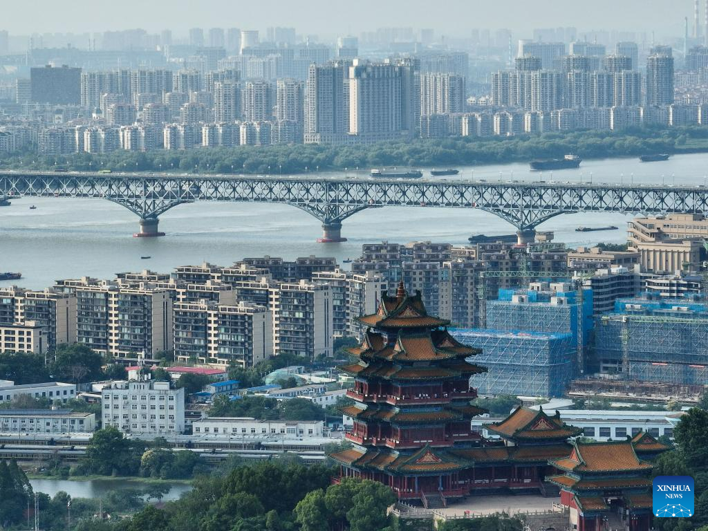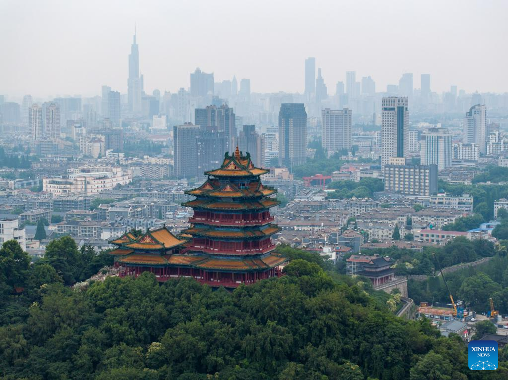 This aerial photo taken on June 13, 2023 shows a view of the Yuejiang Tower in Nanjing, east China's Jiangsu Province. Nanjing, the capital of six dynasties in ancient China, has rich cultural accumulation and unique cultural landscapes. (Xinhua/Li Bo)