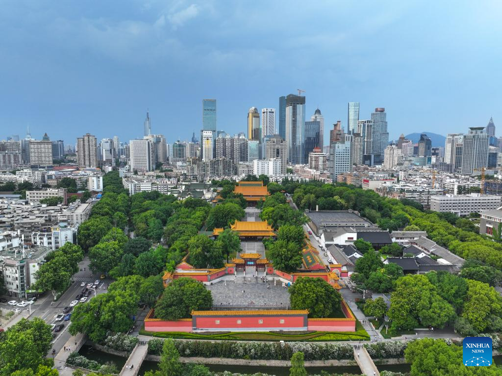 This aerial photo taken on June 10, 2023 shows a view of the Chaotian Palace and Xinjiekou in Nanjing, east China's Jiangsu Province. Nanjing, the capital of six dynasties in ancient China, has rich cultural accumulation and unique cultural landscapes. (Xinhua/Yang Lei)