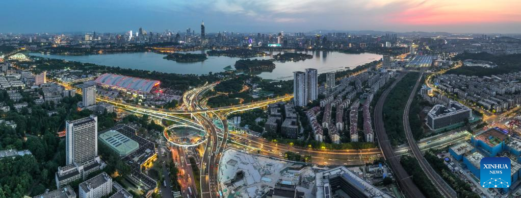 This aerial photo taken on June 9, 2023 shows a view of the Xinzhuang interchange junction and the Xuanwu Lake in Nanjing, east China's Jiangsu Province. Nanjing, the capital of six dynasties in ancient China, has rich cultural accumulation and unique cultural landscapes. (Xinhua/Yang Lei)