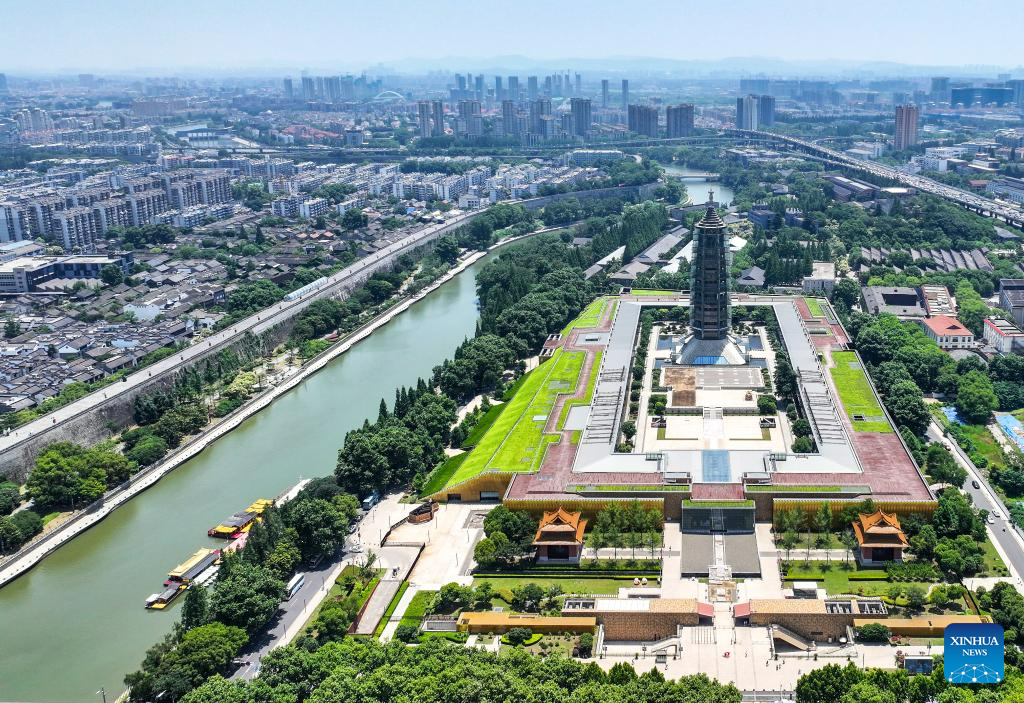This aerial photo taken on June 9, 2023 shows a view of the Grand Baoen Temple Heritage and Scenic Area and the Qinhuai River in Nanjing, east China's Jiangsu Province. Nanjing, the capital of six dynasties in ancient China, has rich cultural accumulation and unique cultural landscapes. (Xinhua/Yang Lei)