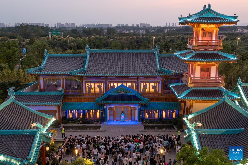 This aerial photo taken on June 8, 2023 shows people having fun at a scenic spot in Nanjing, east China's Jiangsu Province. Nanjing, the capital of six dynasties in ancient China, has rich cultural accumulation and unique cultural landscapes. (Xinhua/Li Bo)