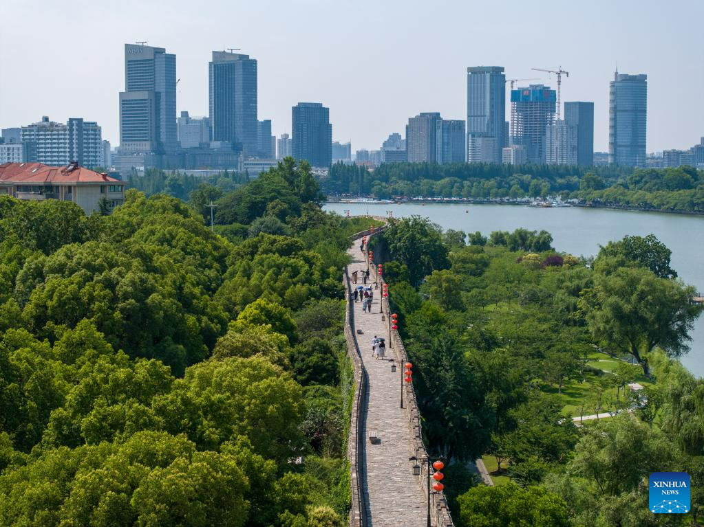 This aerial photo taken on June 12, 2023 shows tourists having fun at the north section of the ancient city wall in Nanjing, east China's Jiangsu Province. Nanjing, the capital of six dynasties in ancient China, has rich cultural accumulation and unique cultural landscapes. (Xinhua/Li Bo)