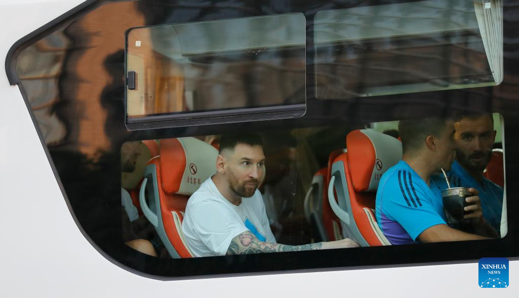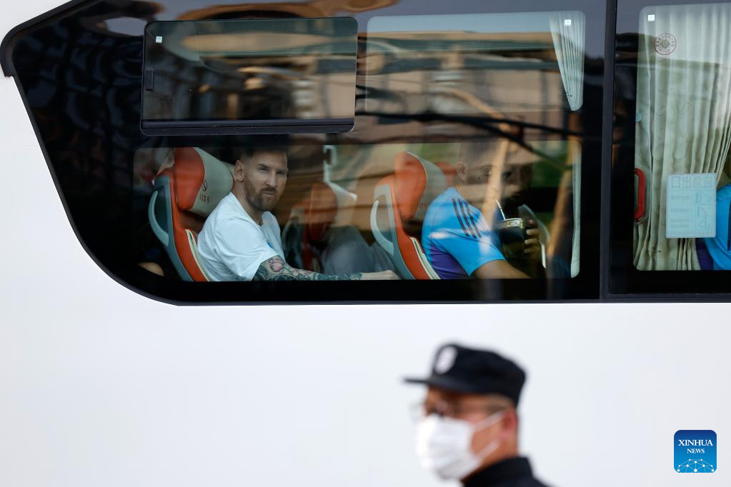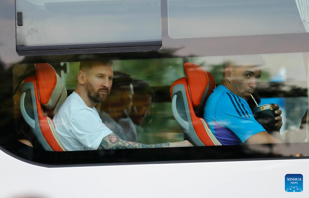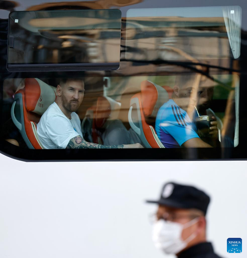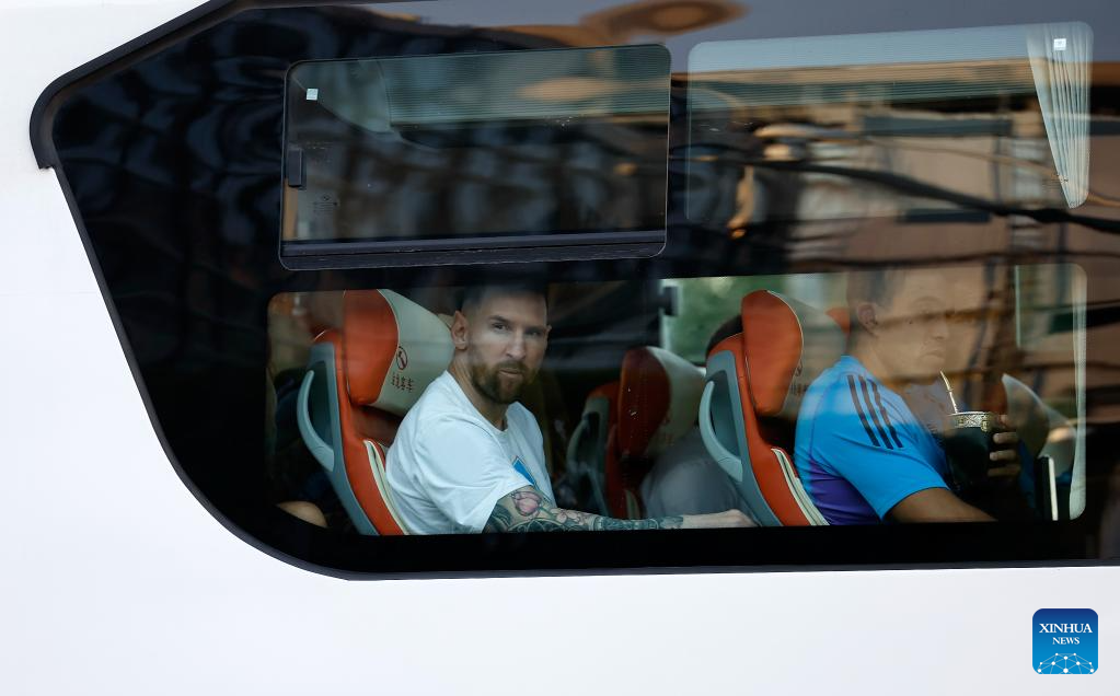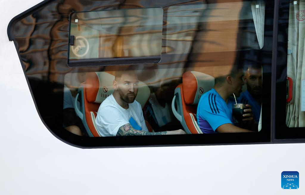 Lionel Messi (L) of Argentina and his teammates arrive by coach ahead of a training session for an international friendly match between Argentina and Australia at Beijing Workers' Stadium in Beijing, June 14, 2023. Argentina will play against Australia here on Thursday. (Xinhua/Zhang Chen)