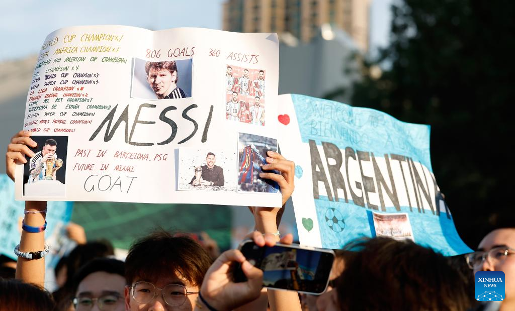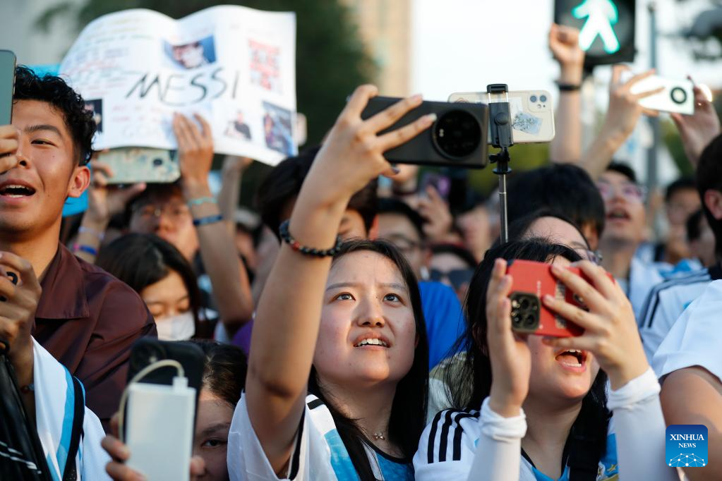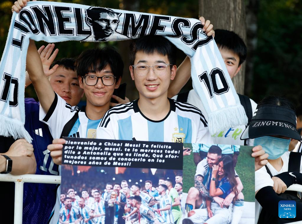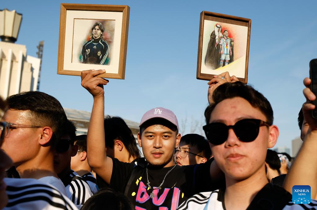 Supporters of Lionel Messi and team Argentina wait outside the stadium ahead of a training session for an international friendly match between Argentina and Australia at Beijing Workers' Stadium in Beijing, June 14, 2023. Argentina will play against Australia here on Thursday. (Xinhua/Wang Lili)