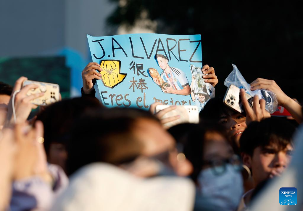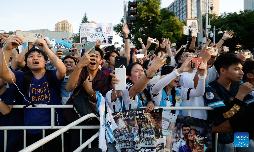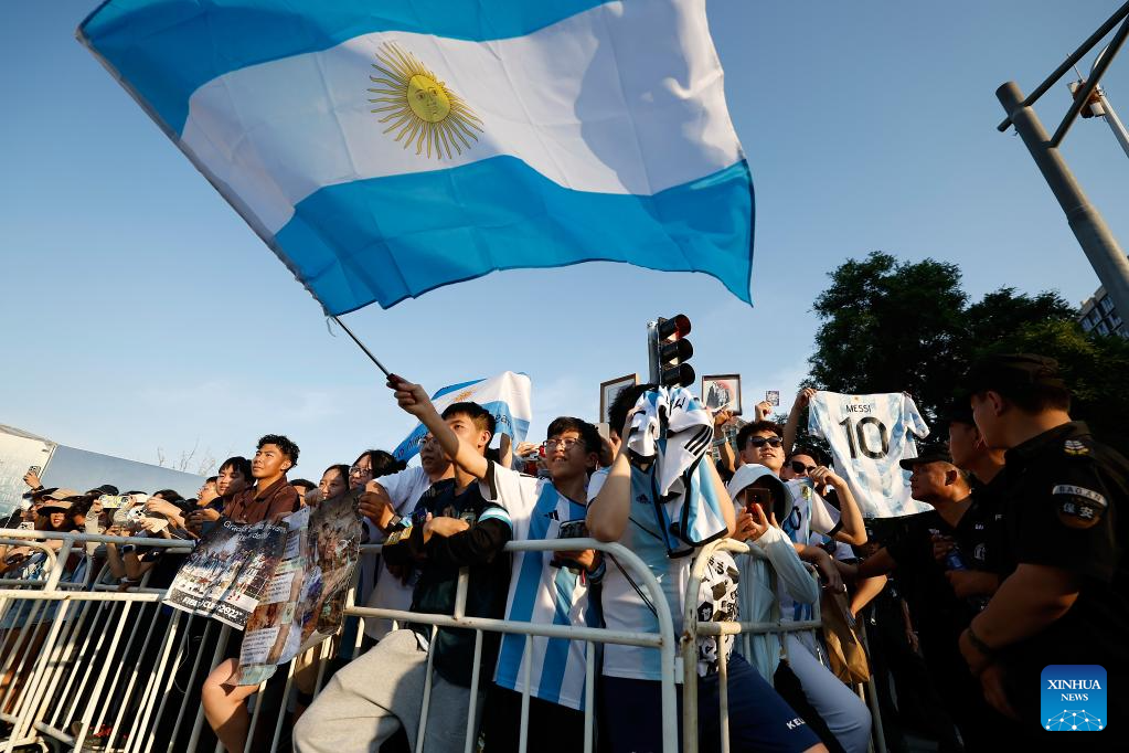 Supporters of team Argentina wait outside the stadium ahead of a training session for an international friendly match between Argentina and Australia at Beijing Workers' Stadium in Beijing, June 14, 2023. Argentina will play against Australia here on Thursday. (Xinhua/Wang Lili)