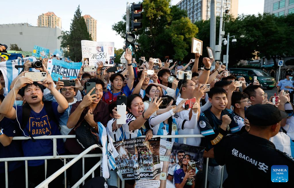 Supporters cheer as coach of Argentina team arrives ahead of a training session for an international friendly match between Argentina and Australia at Beijing Workers' Stadium in Beijing, June 14, 2023. Argentina will play against Australia here on Thursday. (Xinhua/Zhang Chen)