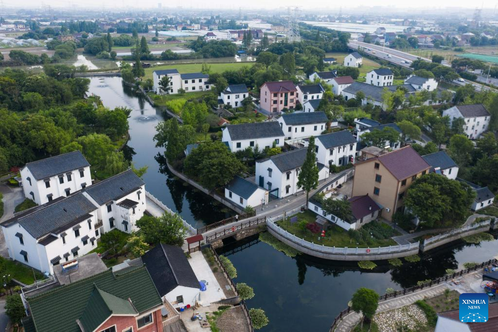 This aerial photo taken on June 14, 2023 shows a view of Xushan Village in Nanhu District, Jiaxing City, east China's Zhejiang Province.