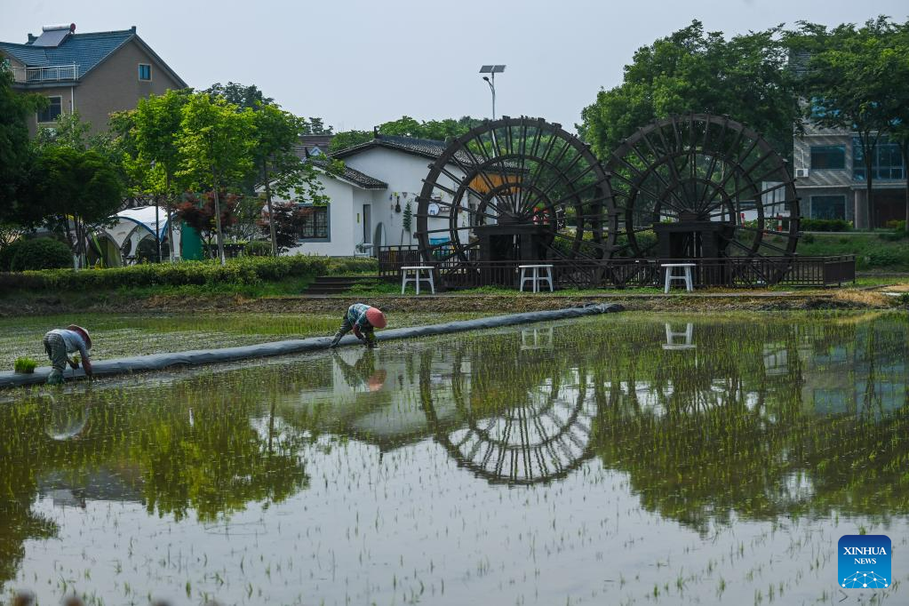 Farmers work in a paddy field in Lianfeng Village of Nanhu District, Jiaxing City, east China's Zhejiang Province, June 14, 2023.