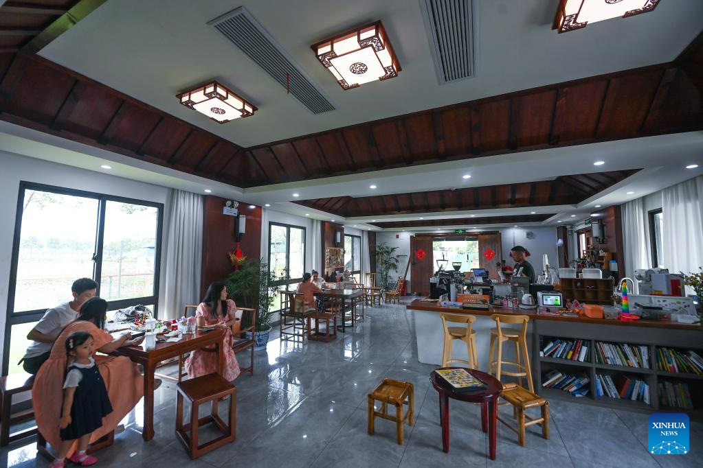 Tourists sit in a cafe in Lianfeng Village of Nanhu District, Jiaxing City, east China's Zhejiang Province, June 14, 2023.