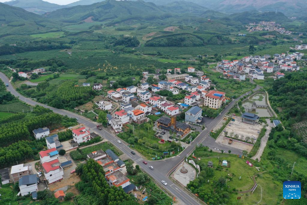 This aerial photo shows a view of Dacun Village in Luzhai County of Liuzhou City, south China's Guangxi Zhuang Autonomous Region, June 14, 2023. In recent years, Luzhai County has been exploring new models to develop its village cooperatives. (Xinhua/Huang Xiaobang)