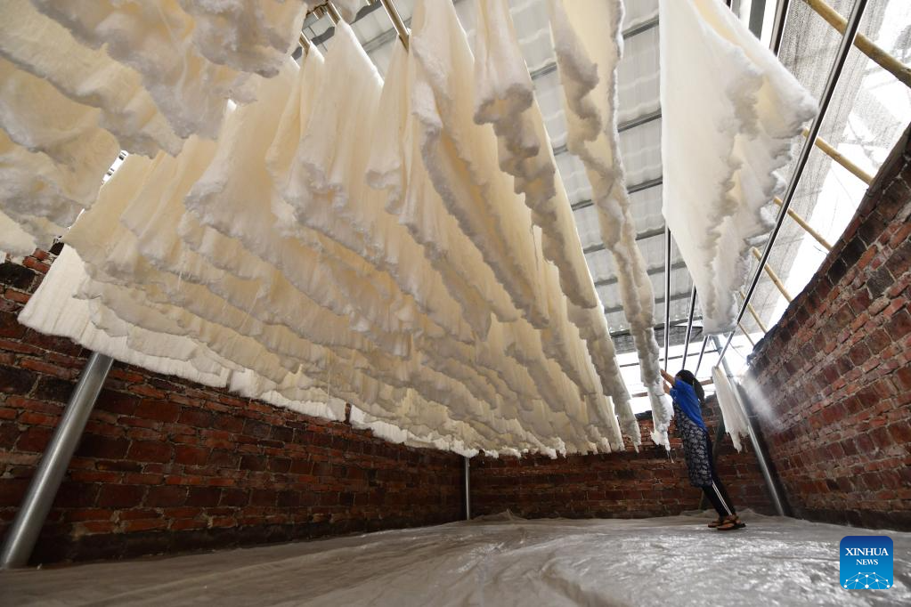 A woman works at a plant making silk quilts in Shanjiao Village of Luzhai County, Liuzhou City, south China's Guangxi Zhuang Autonomous Region, June 14, 2023. In recent years, Luzhai County has been exploring new models to develop its village cooperatives. (Xinhua/Huang Xiaobang)