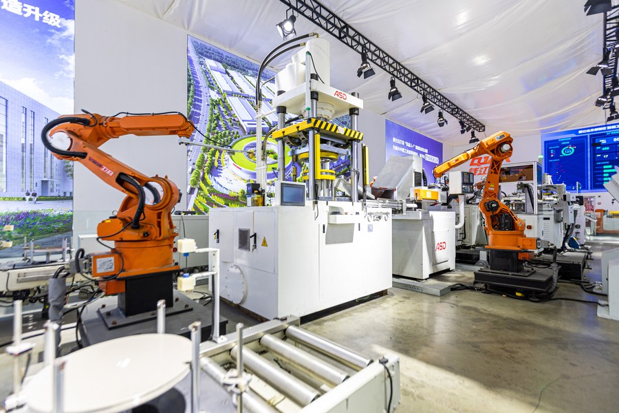 This photo taken on April 27, 2023 shows an automatic production line at a factory of Zhejiang Aishida Co., Ltd. in Wenling, east China's Zhejiang Province. (Photo by Xu Weijie/Xinhua)