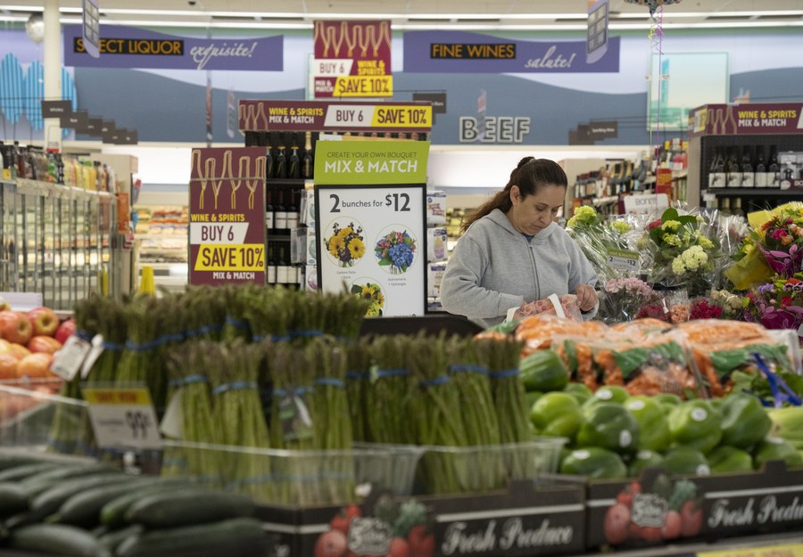 A customer shops at a supermarket in San Mateo, California, the United States, April 12, 2023. (Photo by Li Jianguo/Xinhua)