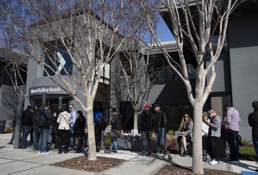 People queue up outside the headquarters of the Silicon Valley Bank (SVB) in Santa Clara, California, the United States, March 13, 2023. (Photo by Li Jianguo/Xinhua)