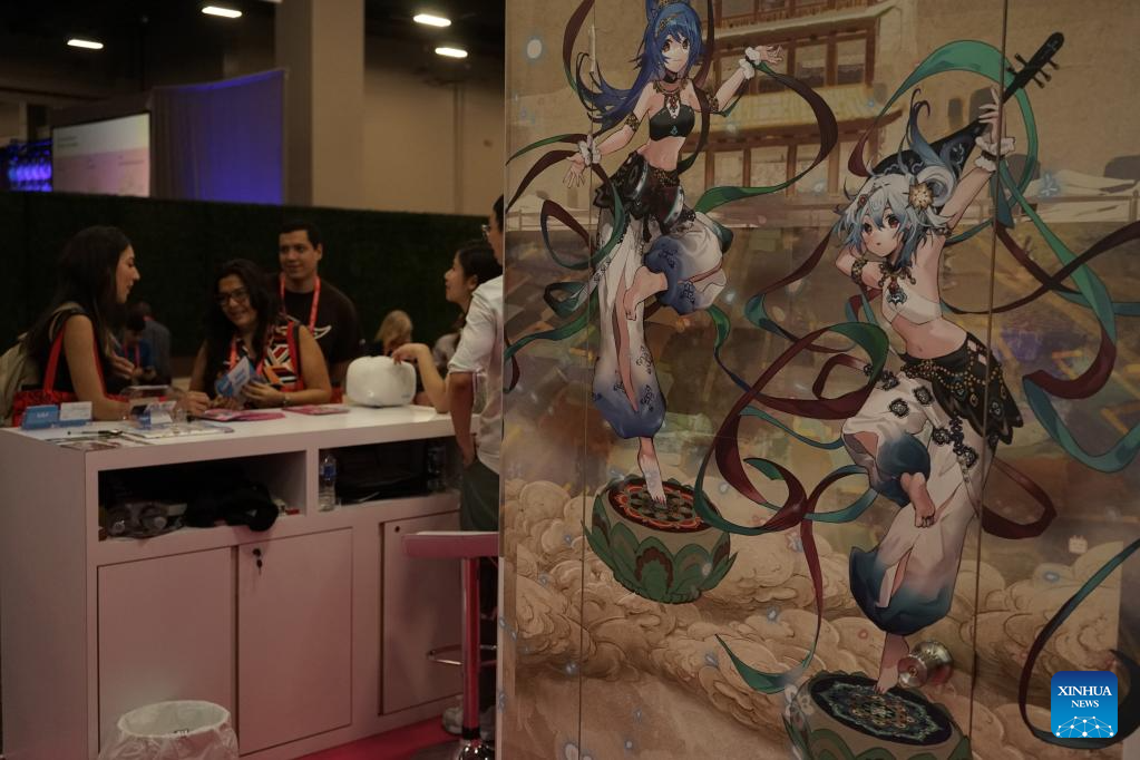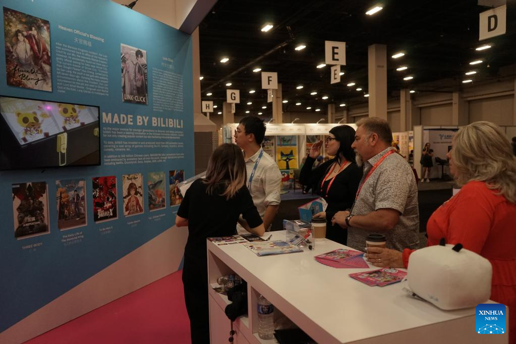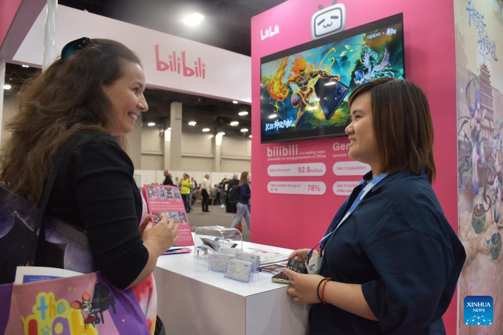 People visit the exhibition area of bilibili, a leading video community for young generations in China, during Licensing Expo 2023 in Las Vegas, the United States, on June 13, 2023. (Photo by Zeng Hui/Xinhua)