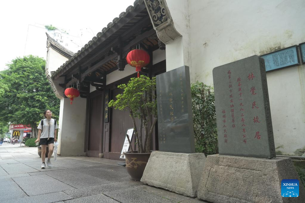 A tourist walks past the former residence of Lin Juemin, a renowned revolutionary hero, in Sanfangqixiang (the Three Lanes and Seven Alleys) in Fuzhou, southeast China's Fujian Province, June 14, 2023. Sanfangqixiang, or the Three Lanes and Seven Alleys, is a 40-hectare complex famous for its traditional urban fabric of lanes and alleys. The green slate walkways are lined by ancestral houses, featuring white walls and black tiles.