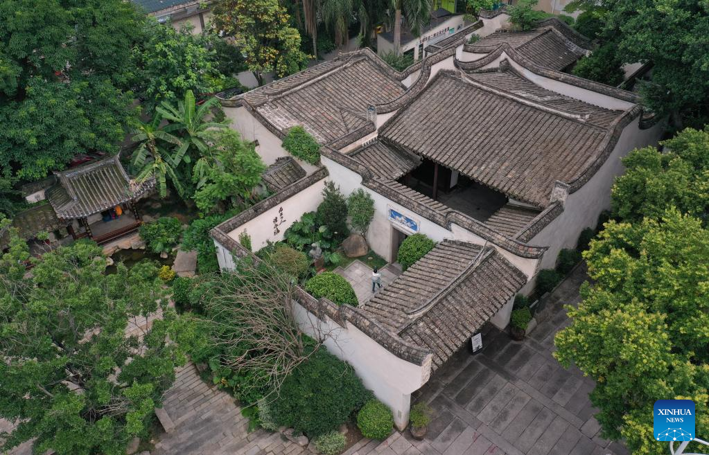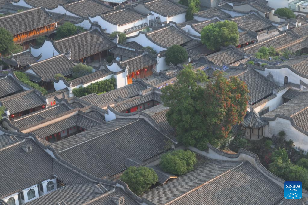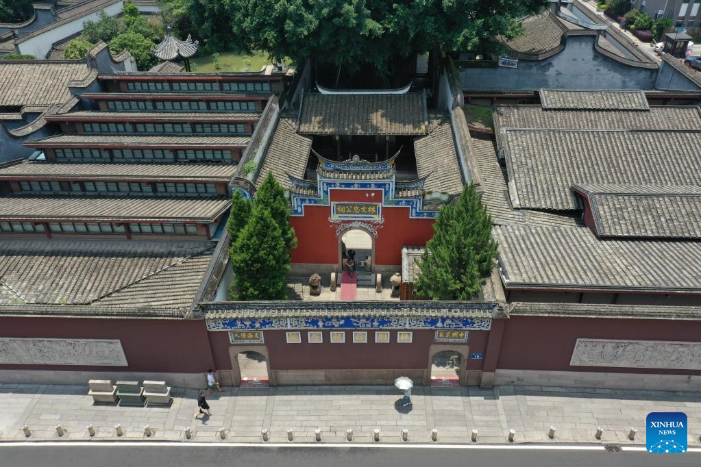 This aerial photo taken on June 13, 2023 shows a view of the Lin Zexu Memorial Hall in Sanfangqixiang (the Three Lanes and Seven Alleys) in Fuzhou, southeast China's Fujian Province. Lin Zexu, a Qing Dynasty (1644-1911) official, led the fight against opium smuggling. Sanfangqixiang, or the Three Lanes and Seven Alleys, is a 40-hectare complex famous for its traditional urban fabric of lanes and alleys. The green slate walkways are lined by ancestral houses, featuring white walls and black tiles.