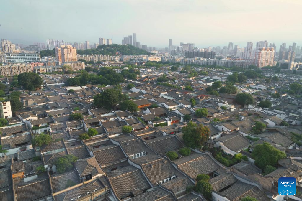 This aerial photo taken on June 14, 2023 shows a view of the former residence of Lin Juemin, a renowned revolutionary hero, in Sanfangqixiang (the Three Lanes and Seven Alleys) in Fuzhou, southeast China's Fujian Province. Sanfangqixiang, or the Three Lanes and Seven Alleys, is a 40-hectare complex famous for its traditional urban fabric of lanes and alleys. The green slate walkways are lined by ancestral houses, featuring white walls and black tiles.