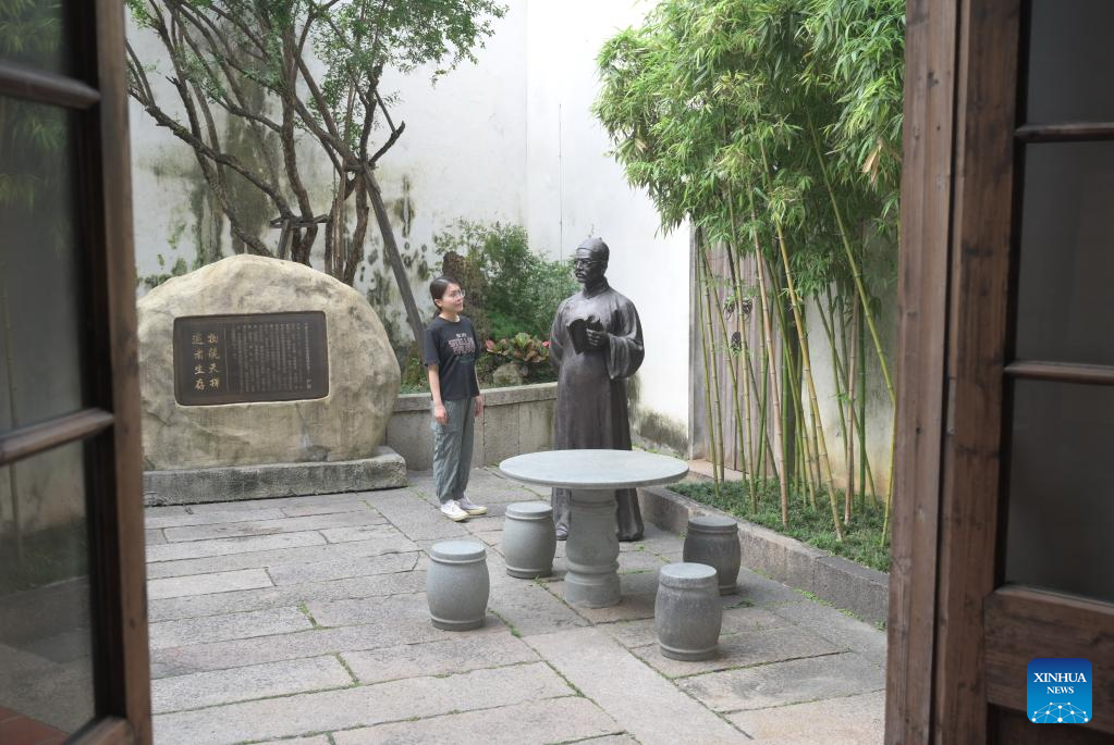 A tourist visits Lin Zexu Memorial Hall in Sanfangqixiang (the Three Lanes and Seven Alleys) in Fuzhou, southeast China's Fujian Province, June 13, 2023. Lin Zexu, a Qing Dynasty (1644-1911) official, led the fight against opium smuggling. Sanfangqixiang, or the Three Lanes and Seven Alleys, is a 40-hectare complex famous for its traditional urban fabric of lanes and alleys. The green slate walkways are lined by ancestral houses, featuring white walls and black tiles.