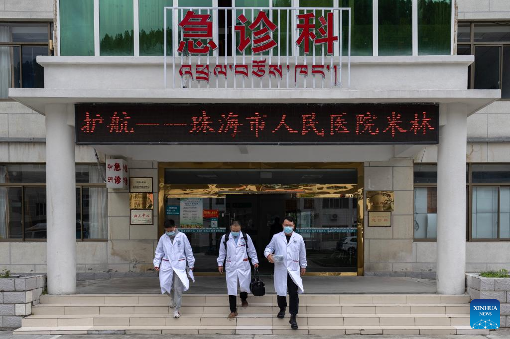 Wang Zhenjiang (C), local doctor Nyima Yexe (L) and Wang Tongxu walk out of the emergency building of Mainling People's Hospital in Mainling City, southwest China's Tibet Autonomous Region, June 12, 2023. Wang Zhenjiang, Chen Bing and Wang Tongxu are doctors of a medical team from a hospital in Zhuhai, south China's Guangdong Province, who arrived in Tibet in late February.