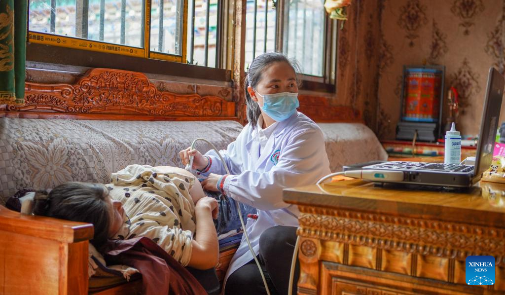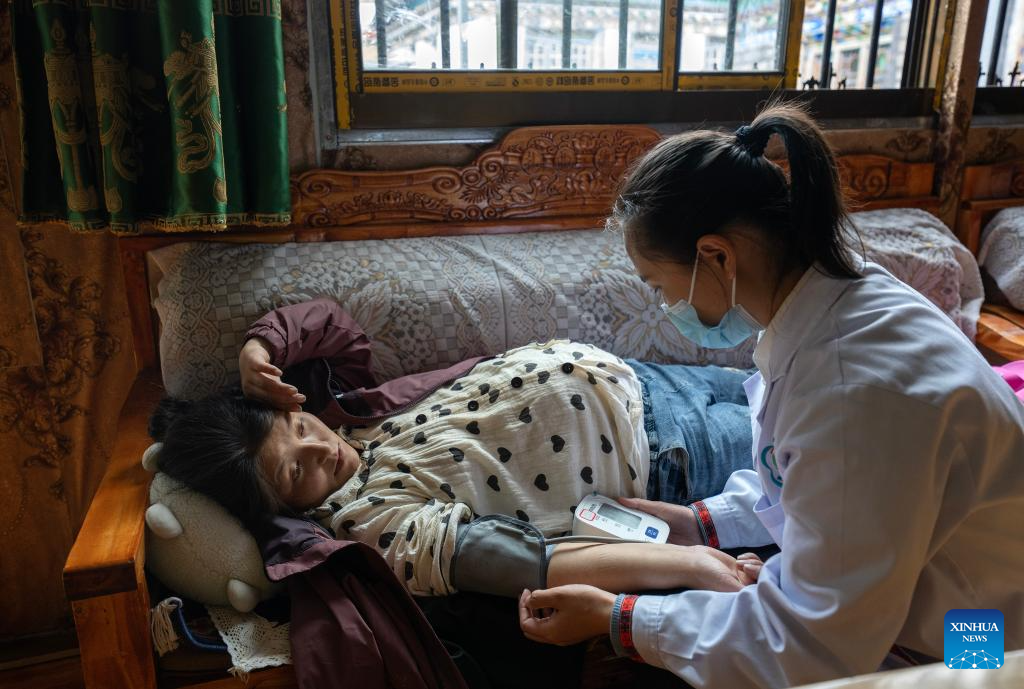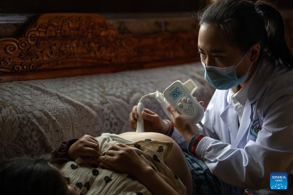 Chen Bing (R) conducts obstetric examination on pregnant woman Zhaxi Yangzom at a village in Mainling City, southwest China's Tibet Autonomous Region, June 12, 2023. Wang Zhenjiang, Chen Bing and Wang Tongxu are doctors of a medical team from a hospital in Zhuhai, south China's Guangdong Province, who arrived in Tibet in late February.