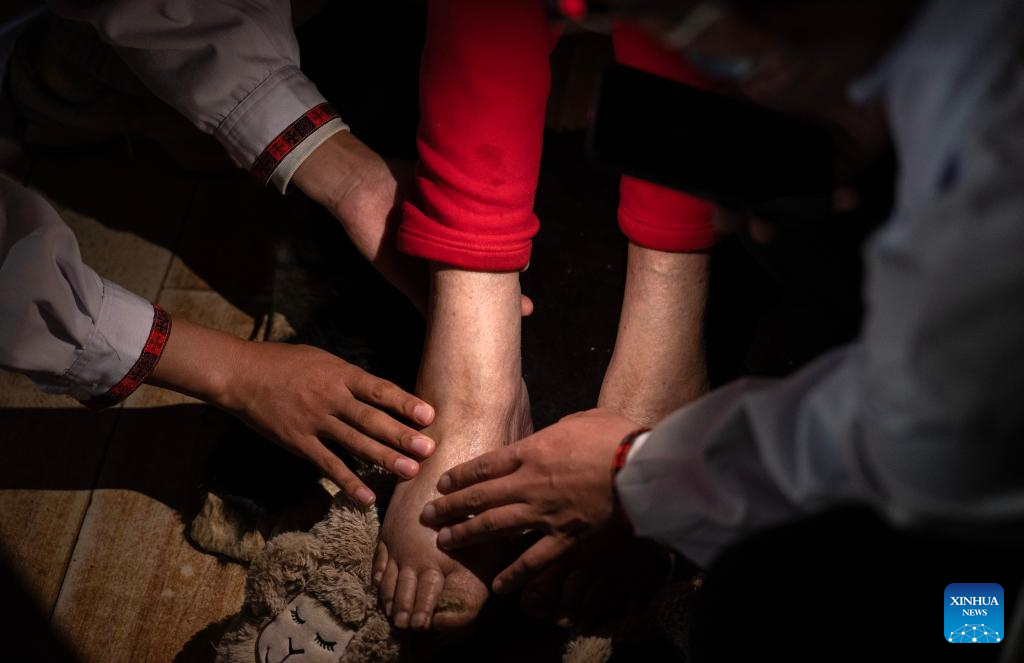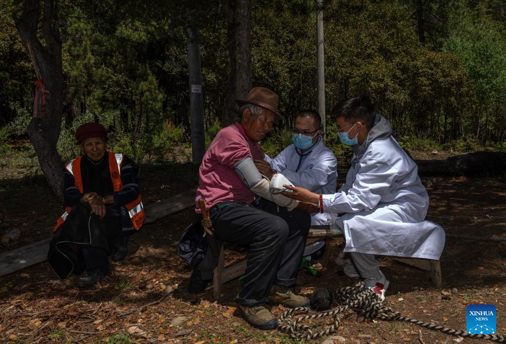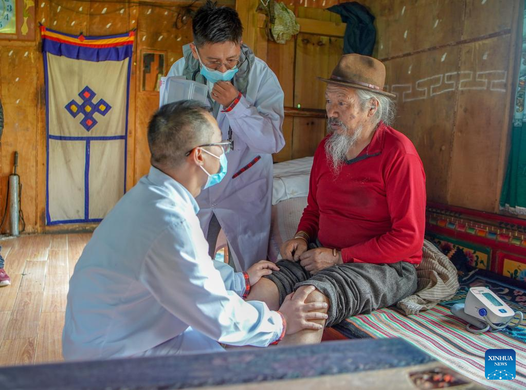 Wang Zhenjiang (R) checks the feet for an 89-year-old patient at a village in Mainling City, southwest China's Tibet Autonomous Region, June 12, 2023. Wang Zhenjiang, Chen Bing and Wang Tongxu are doctors of a medical team from a hospital in Zhuhai, south China's Guangdong Province, who arrived in Tibet in late February.