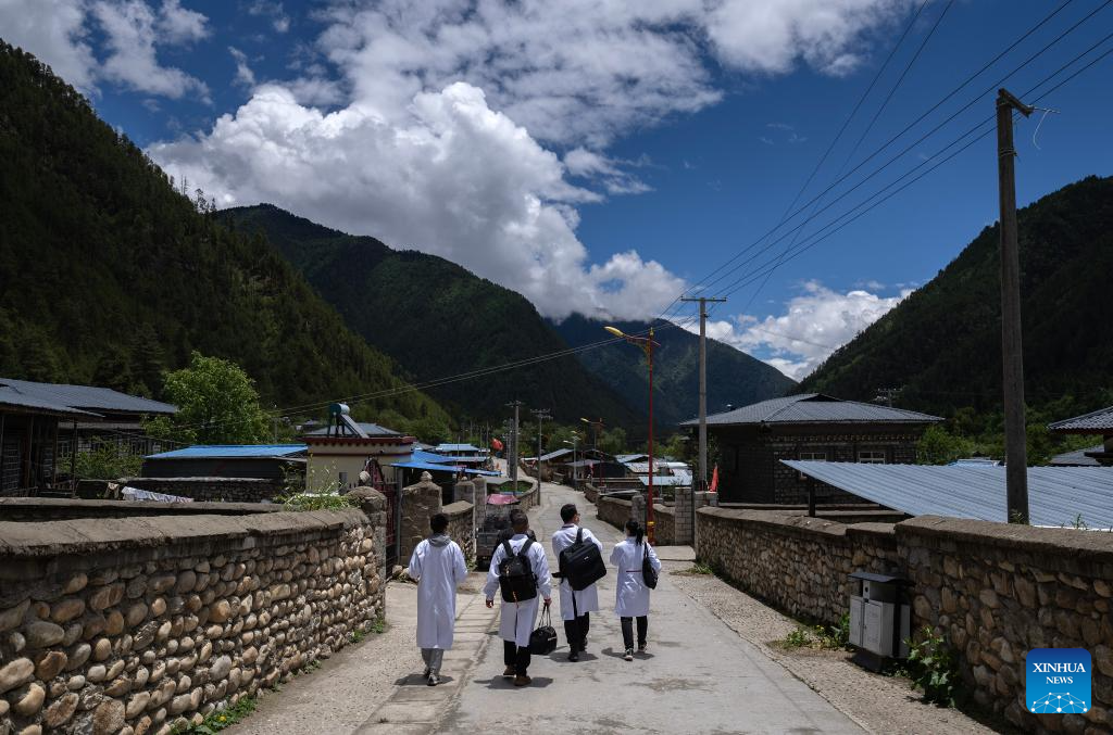 Wang Zhenjiang (2nd L), Wang Tongxu (2nd R), Chen Bing (1st R) and local doctor Nyima Yexe walk on a road at a village in Mainling City, southwest China's Tibet Autonomous Region, June 12, 2023. Wang Zhenjiang, Chen Bing and Wang Tongxu are doctors of a medical team from a hospital in Zhuhai, south China's Guangdong Province, who arrived in Tibet in late February.