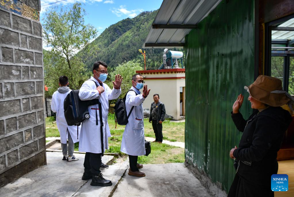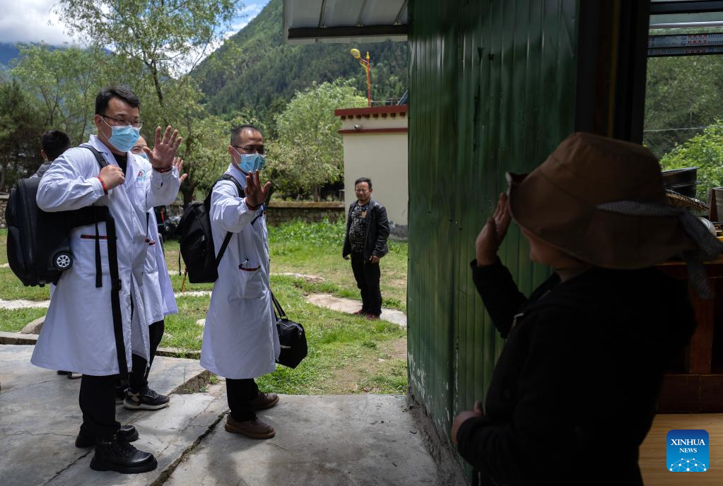 Wang Zhenjiang (2nd L, front), Wang Tongxu (1st L) and Chen Bing wave good-bye to the daughter of a patient at a village in Mainling City, southwest China's Tibet Autonomous Region, June 12, 2023. Wang Zhenjiang, Chen Bing and Wang Tongxu are doctors of a medical team from a hospital in Zhuhai, south China's Guangdong Province, who arrived in Tibet in late February.