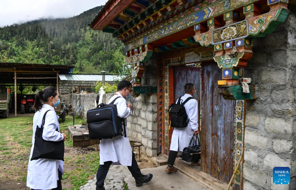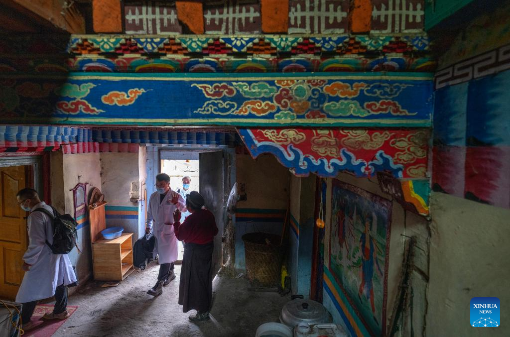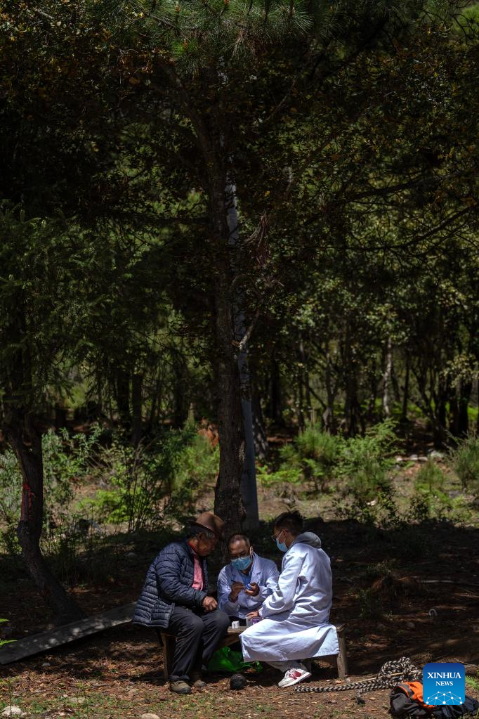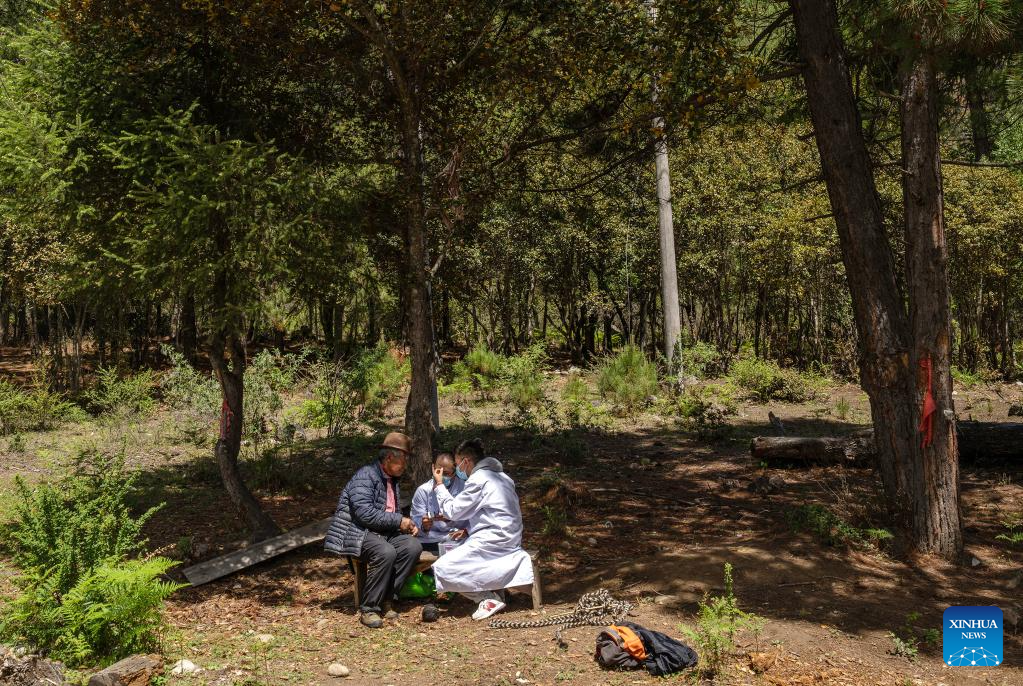 Wang Tongxu treats a patient at a village in Mainling City, southwest China's Tibet Autonomous Region, June 12, 2023. Wang Zhenjiang, Chen Bing and Wang Tongxu are doctors of a medical team from a hospital in Zhuhai, south China's Guangdong Province, who arrived in Tibet in late February.