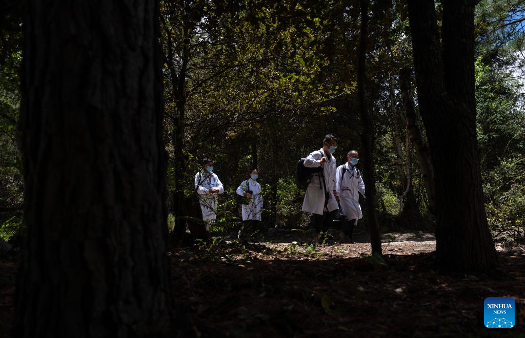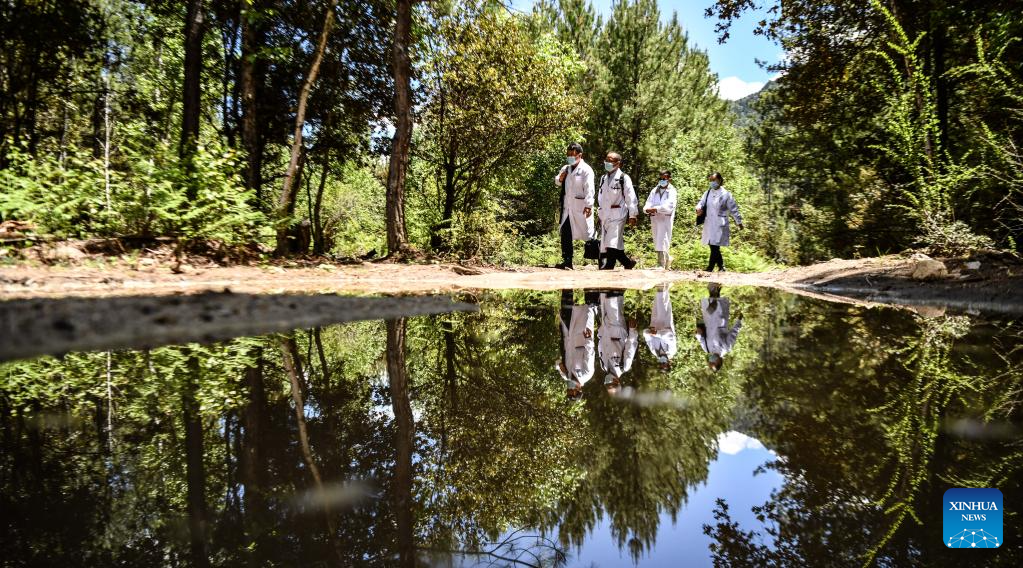 Wang Zhenjiang (1st R), Wang Tongxu (2nd R), Chen Bing (3rd R) and local doctor Nyima Yexe walk through the woods in Mainling City, southwest China's Tibet Autonomous Region, June 12, 2023. Wang Zhenjiang, Chen Bing and Wang Tongxu are doctors of a medical team from a hospital in Zhuhai, south China's Guangdong Province, who arrived in Tibet in late February.