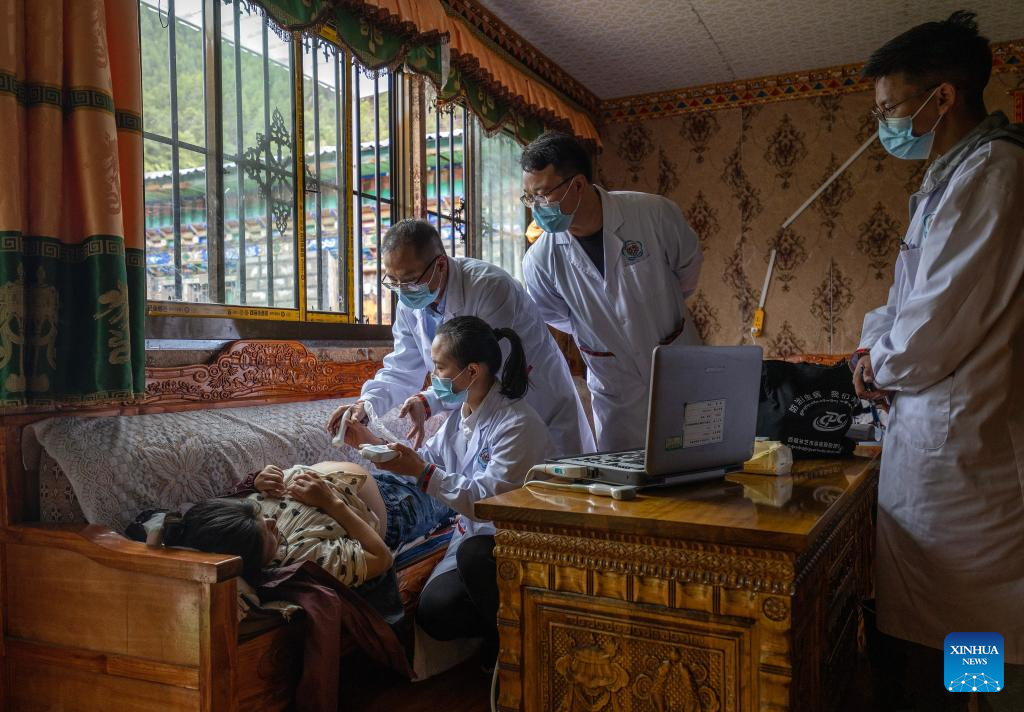 Wang Zhenjiang (L, above), Wang Tongxu (C, above) and local doctor Nyima Yexe (1st R) assist Chen Bing (R, below) in conducting obstetric examination on pregnant woman Zhaxi Yangzom at a village in Mainling City, southwest China's Tibet Autonomous Region, June 12, 2023. Wang Zhenjiang, Chen Bing and Wang Tongxu are doctors of a medical team from a hospital in Zhuhai, south China's Guangdong Province, who arrived in Tibet in late February.