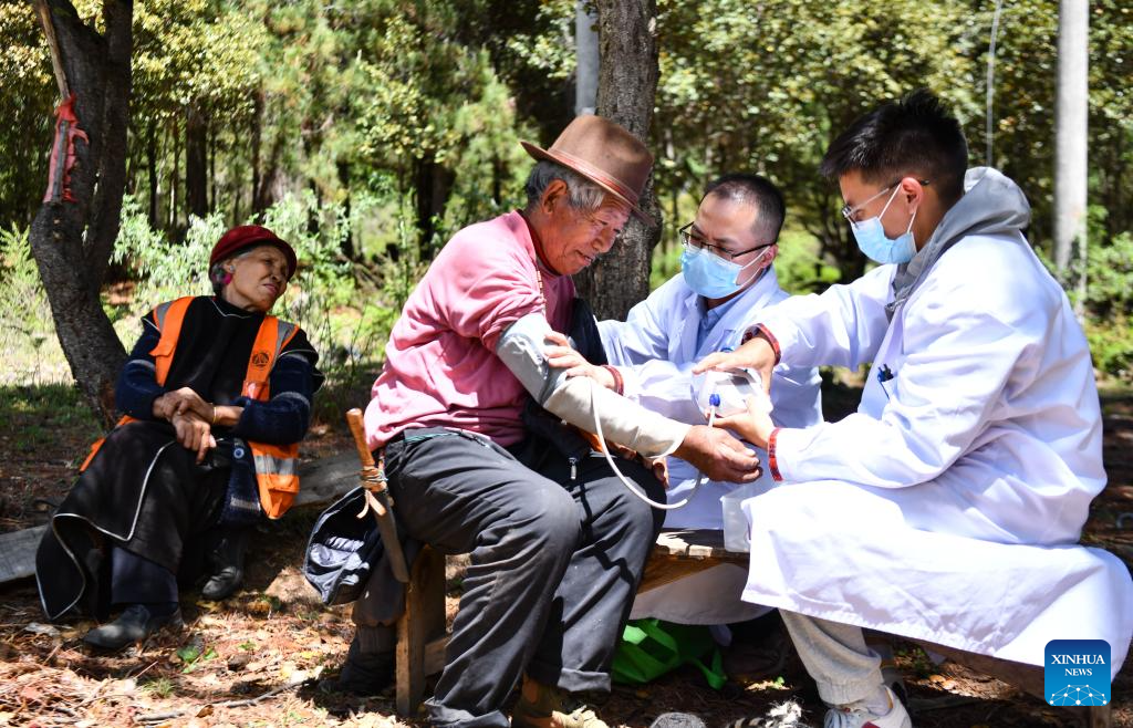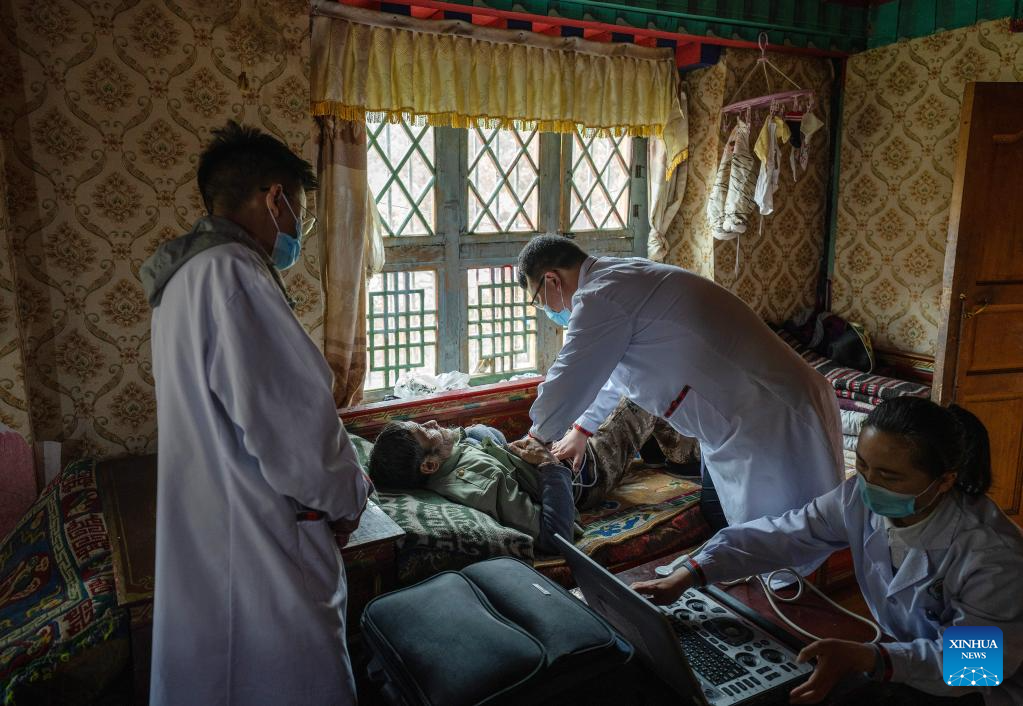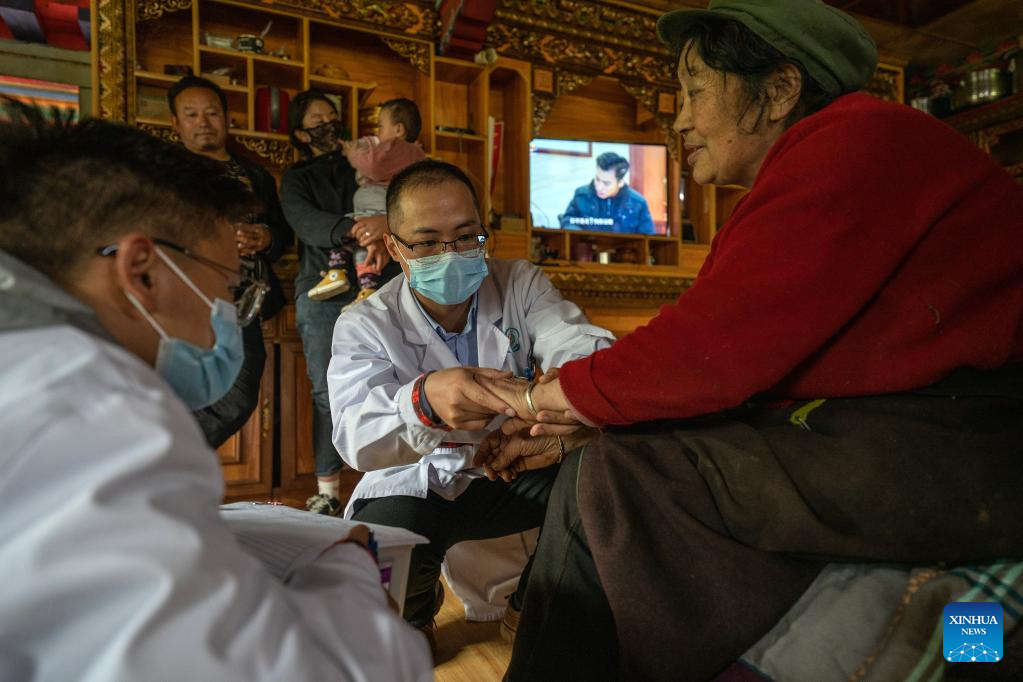 Wang Zhenjiang (2nd R) checks a patient's fingers at a village in Mainling City, southwest China's Tibet Autonomous Region, June 12, 2023. Wang Zhenjiang, Chen Bing and Wang Tongxu are doctors of a medical team from a hospital in Zhuhai, south China's Guangdong Province, who arrived in Tibet in late February.