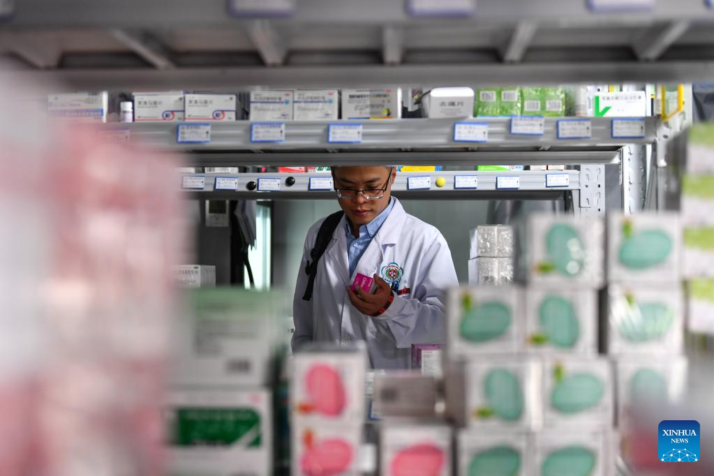 Wang Zhenjiang takes medicine from the storehouse of Mainling People's Hospital before their home visit to a village in Mainling City, southwest China's Tibet Autonomous Region, June 12, 2023. Wang Zhenjiang, Chen Bing and Wang Tongxu are doctors of a medical team from a hospital in Zhuhai, south China's Guangdong Province, who arrived in Tibet in late February.