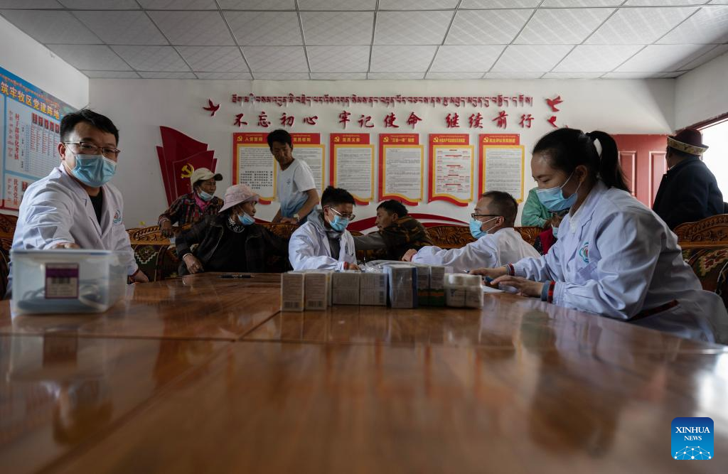 Wang Zhenjiang (2nd R, front), Wang Tongxu (1st L, front), Chen Bing (1st R, front) and local doctor Nyima Yexe (3rd L, front) provide medical services for villagers at a meeting room in a village in Mainling City, southwest China's Tibet Autonomous Region, June 12, 2023. Wang Zhenjiang, Chen Bing and Wang Tongxu are doctors of a medical team from a hospital in Zhuhai, south China's Guangdong Province, who arrived in Tibet in late February.