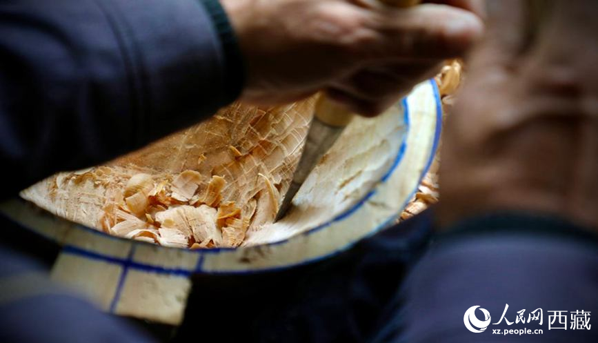 Norbu Tseten, an inheritor of the craft of making Zhanian, a traditional Tibetan musical instrument, makes a piece of Zhanian. (People's Daily Online/Tersing Norbu)