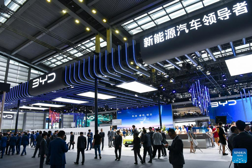 This photo taken on June 16, 2023 shows the booth of Chinese carmaker BYD during the 27th Guangdong-Hong Kong-Macao Greater Bay Area International Auto Show at the Shenzhen Convention and Exhibition Center in Shenzhen, south China's Guangdong Province. The auto show kicked off here on Friday and will last till June 24. (Xinhua/Liang Xu)