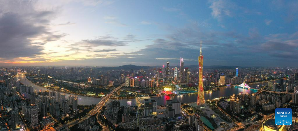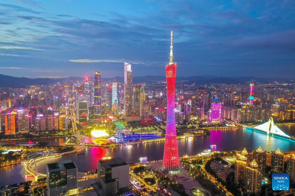 This aerial photo taken on June 10, 2023 shows the night view of the urban areas in Guangzhou, south China's Guangdong Province. Guangzhou has a history of more than 2,000 years. The city has been a place of cultural integration between Chinese and foreign cultures since ancient times. It has manifested the openness and inclusiveness involved with Chinese culture. (Xinhua/Liu Dawei)