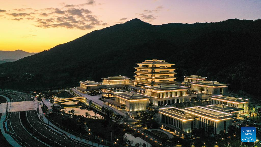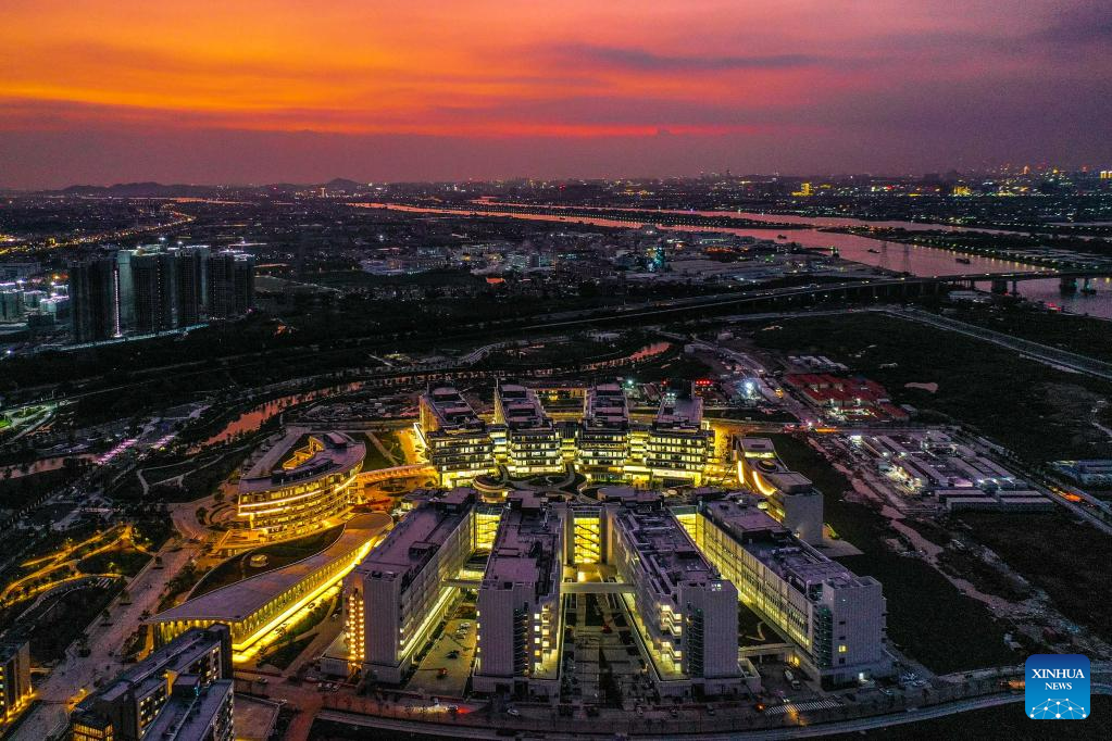 This aerial photo taken on Aug. 15, 2022 shows the night view of the campus of the Hong Kong University of Science and Technology (Guangzhou) in Guangzhou, south China's Guangdong Province. Guangzhou has a history of more than 2,000 years. The city has been a place of cultural integration between Chinese and foreign cultures since ancient times. It has manifested the openness and inclusiveness involved with Chinese culture. (Xinhua/Liu Dawei)