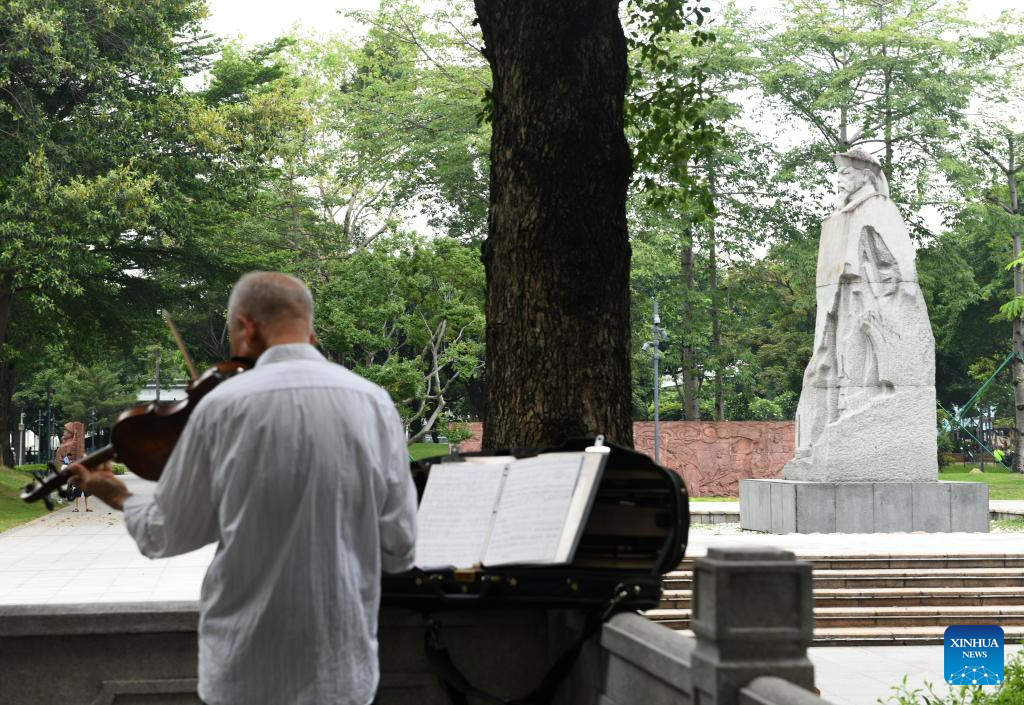 A man plays the violin at the Lin Zexu memorial park in Yuexiu District of Guangzhou, south China's Guangdong Province, June 13, 2023. Guangzhou has a history of more than 2,000 years. The city has been a place of cultural integration between Chinese and foreign cultures since ancient times. It has manifested the openness and inclusiveness involved with Chinese culture. (Xinhua/Lu Hanxin)
