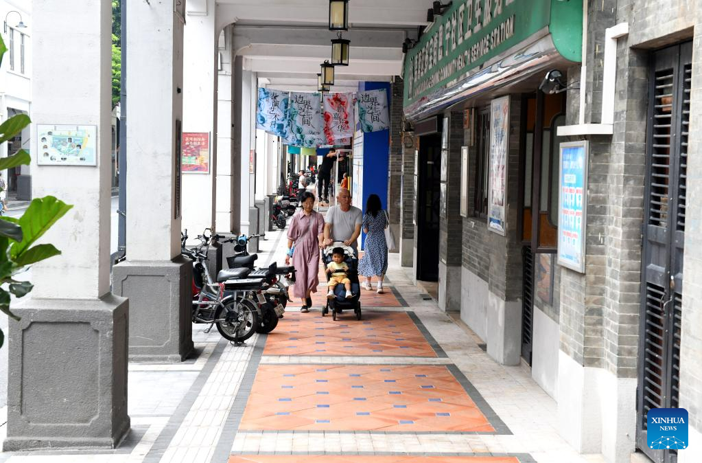People walk at the Qilou street in Guangzhou, south China's Guangdong Province, June 14, 2023. Guangzhou has a history of more than 2,000 years. The city has been a place of cultural integration between Chinese and foreign cultures since ancient times. It has manifested the openness and inclusiveness involved with Chinese culture. (Xinhua/Lu Hanxin)
